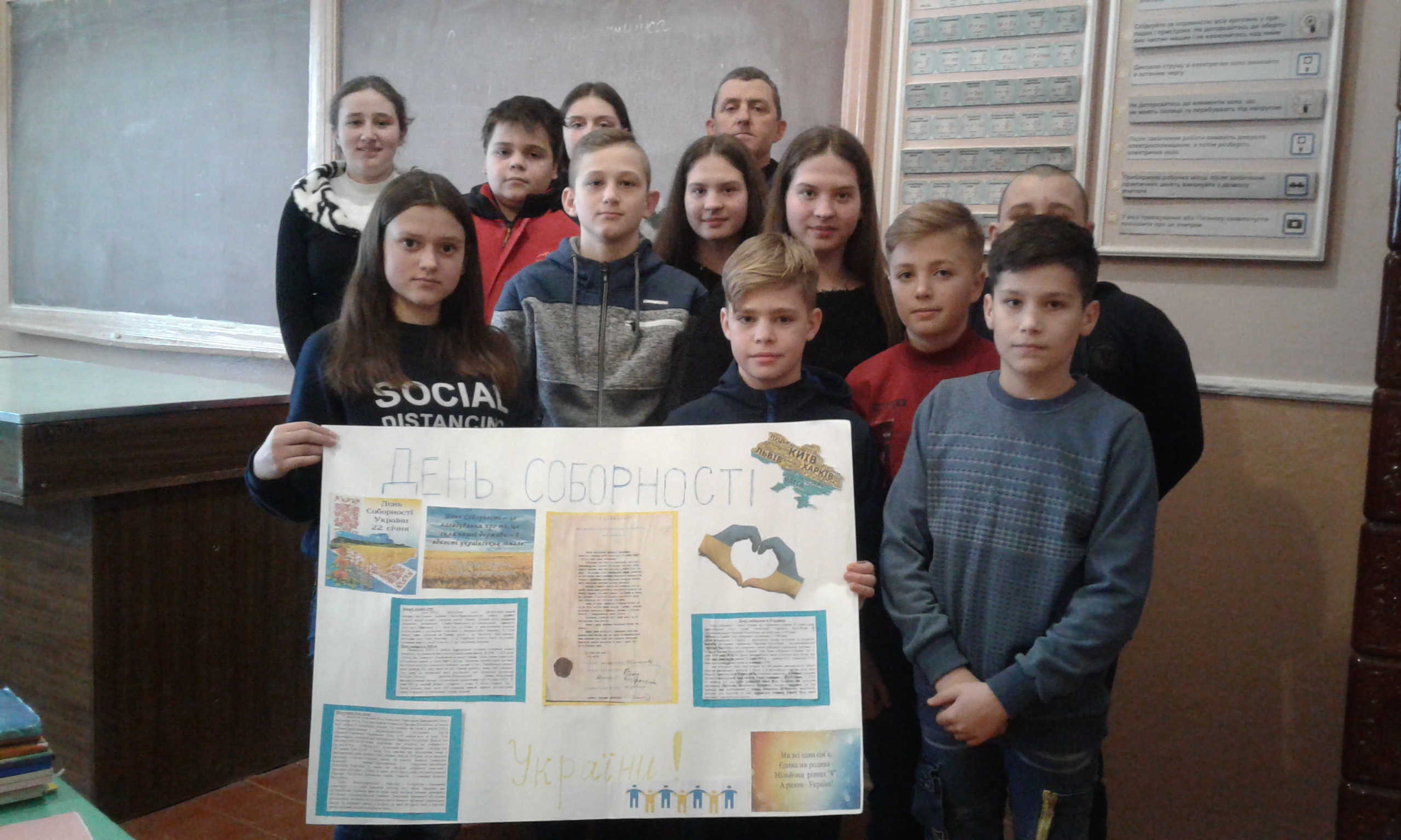 Яка ж багата, розмаїта наша Україна: Схід, Захід, Південь, Північ. Міста, їх архітектура, їх традиції... Але всі вони - українські. Усі ми різні, але всі ми - УКРАЇНЦІ! Любити Україну, знати нашу історію, шанувати українські традиції - наш обов'язок, такими словами розпочала виховну годину Леся Гладьо до своїх шестикласників. Вчитель наголосила про непростий шлях України до єднання та незалежності. Щоб поглибити знання учнів щодо історії свята, було переглянуто відео - вікторину до дня Соборності України.